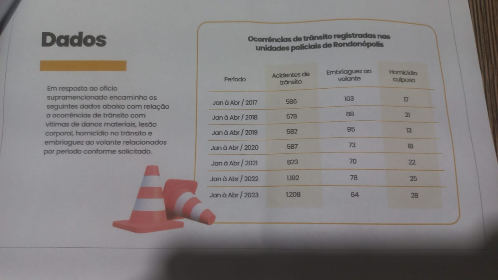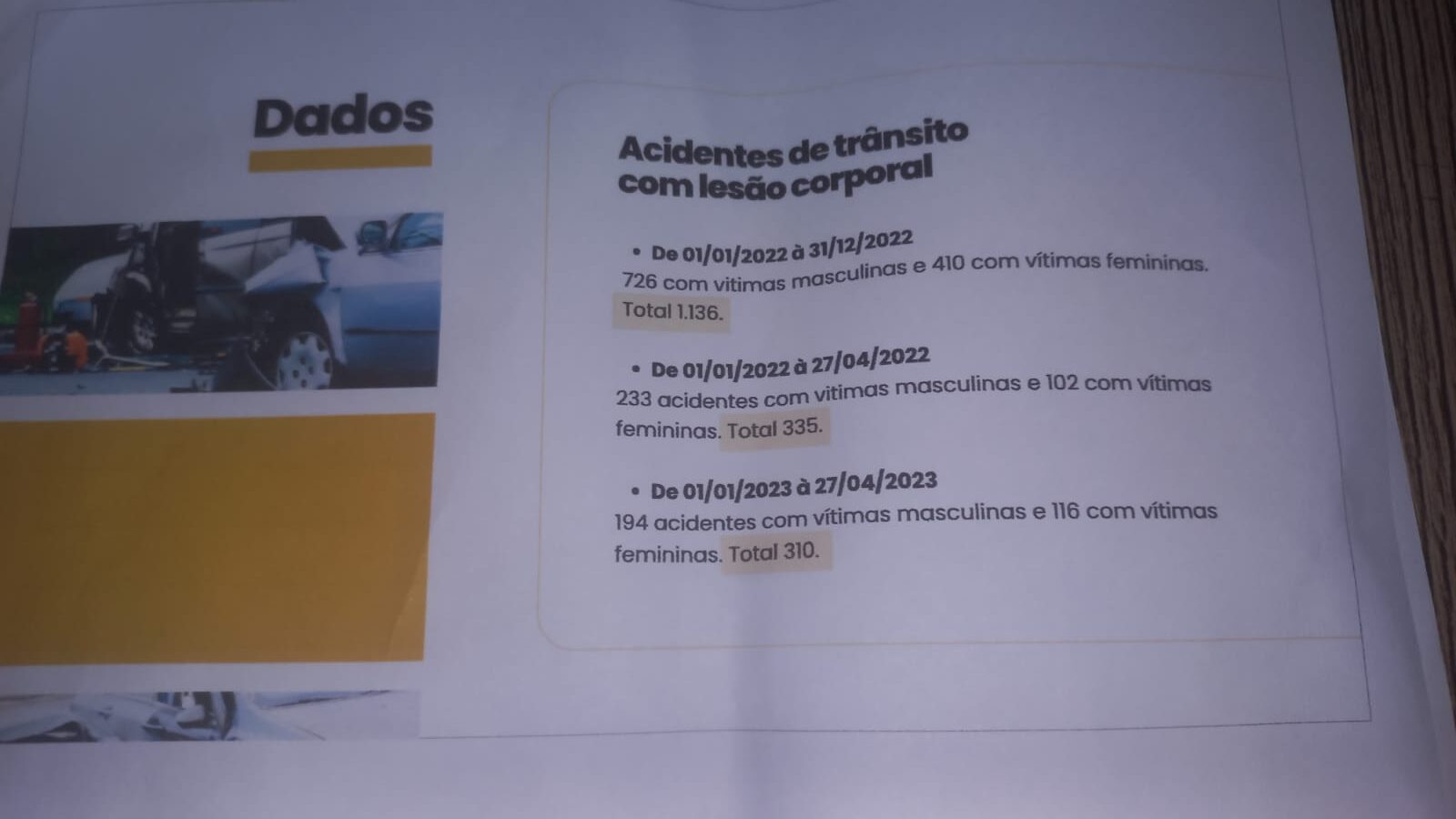 De acordo com o levantamento, de 1 de janeiro a 21 de dezembro de 2022, 66 acidentes com homicídios foram registrados no município. No mesmo período, 1.136 pessoas tiveram lesões corporais em ocorrências de trânsito.