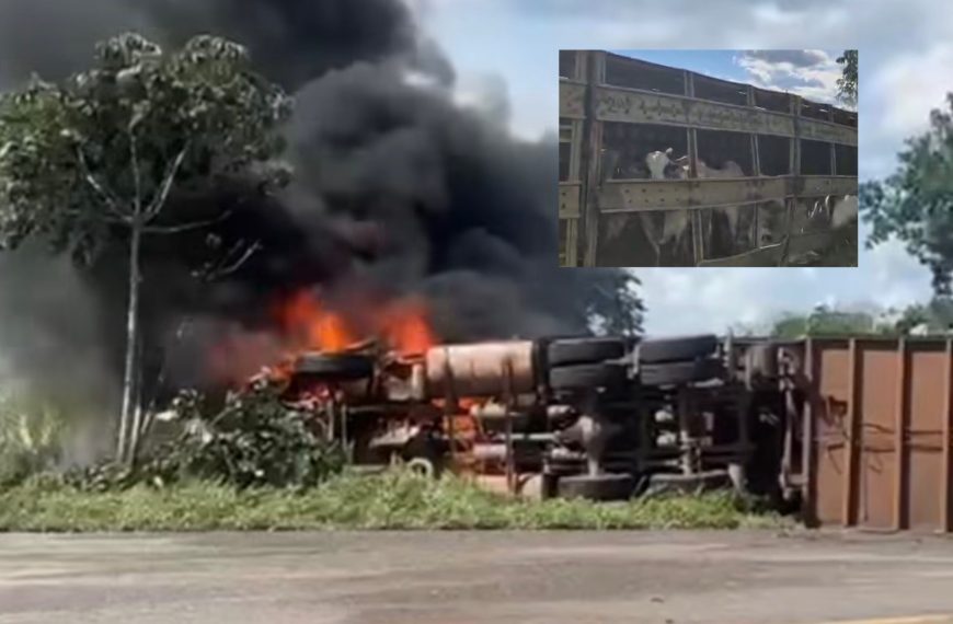 Carreta boiadeira fica em chamas após colidir com Uno e dois morrem na BR-070 em MT; vídeo