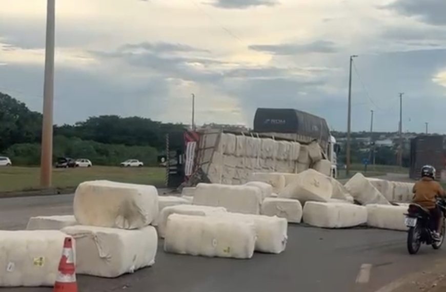 Uma carreta tombou e interditou o sentido norte da BR-163, no km 119, em Rondonópolis, na tarde desta segunda-feira (27), por volta das 14h57, após perder o controle e espalhar carga de pluma de algodão sobre a pista.