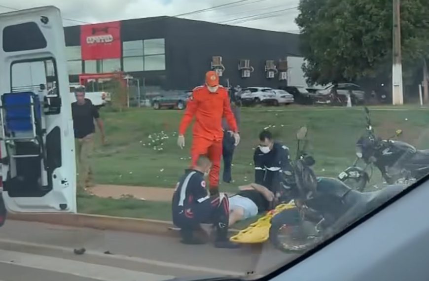 Colisão entre motos deixa casal ferido após parada para idosa atravessar avenida em Rondonópolis; vídeo