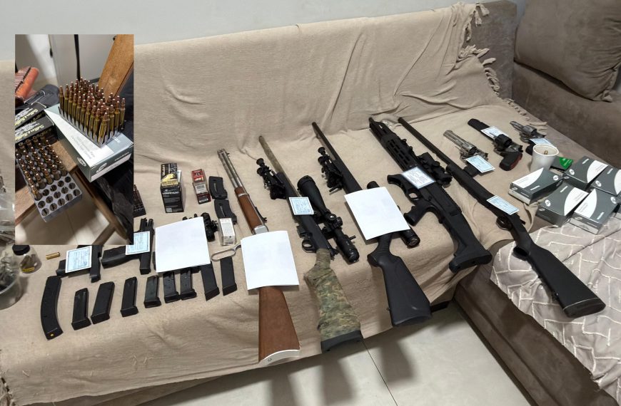 Conforme a Polícia Civil, durante o cumprimento dos mandados, a equipe prendeu em flagrante um homem de 46 anos por posse ilegal de munição de uso restrito. Em um imóvel, policiais localizaram dois cofres dentro de um cômodo usado como escritório, com diversas armas curtas e longas, além de grande quantidade de munições de vários calibres, inclusive 5.56, e insumos para recarga.