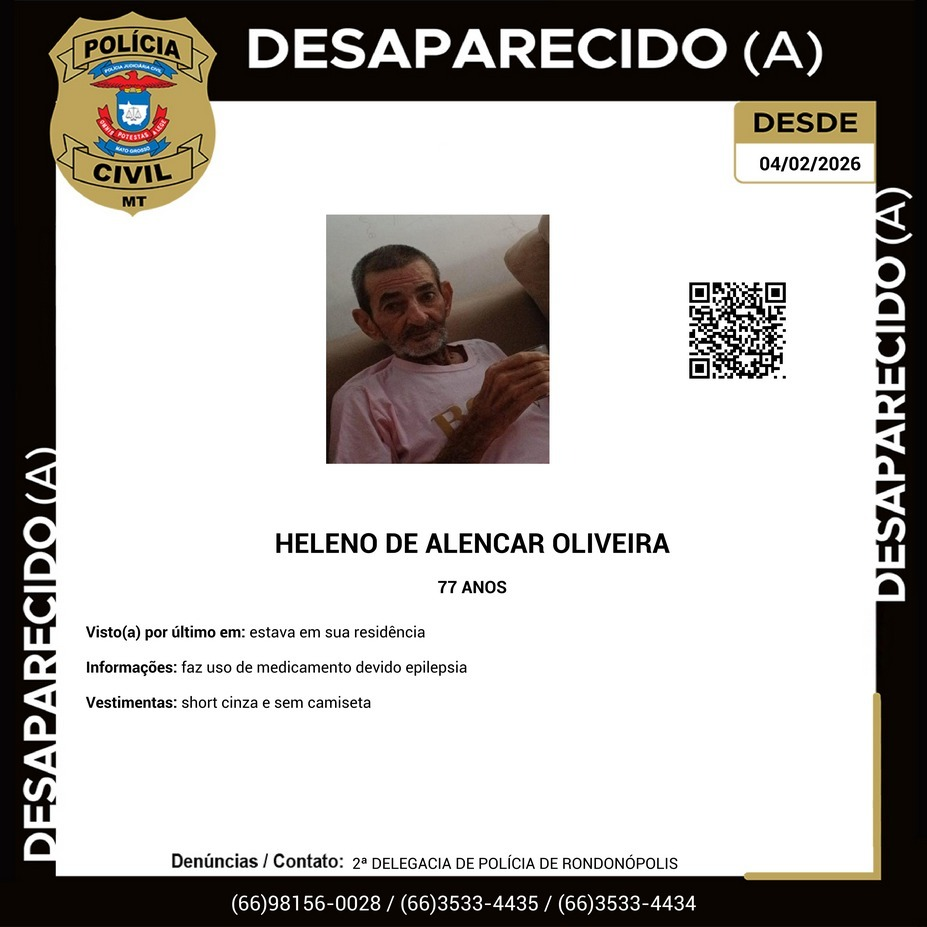 A Polícia Civil de Mato Grosso, por intermédio da Delegacia Especializada de Homicídios e Proteção à Pessoa (DHPP) de Rondonópolis, solicita o apoio da imprensa e da população para obter informações que auxiliem na localização do senhor HELENO DE ALENCAR OLIVEIRA, de 77 anos, desaparecido desde o dia 04 de fevereiro de 2026.