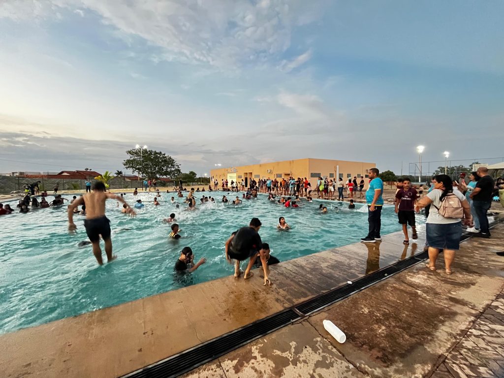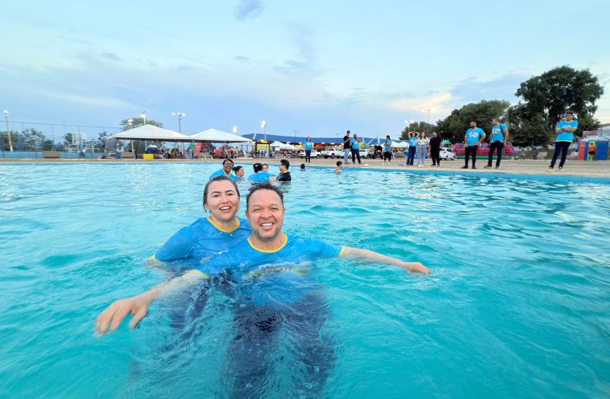 A maratona de visitas foi encerrada com um momento descontraído: o prefeito, a primeira-dama e membros da equipe de governo encerraram o evento com um mergulho na piscina do Centro de Convivência da Vila Operária.
