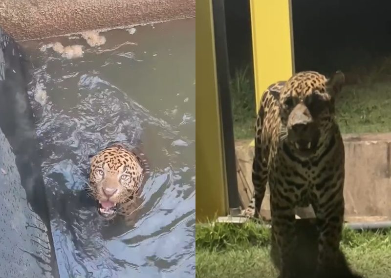 Onça-pintada encurralada em canal mobiliza operação e vídeos viralizam em MT
