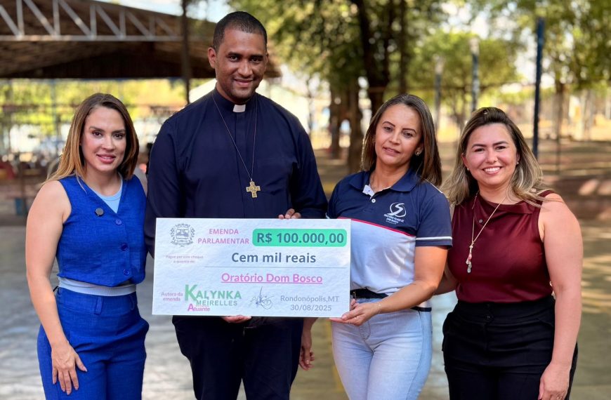 A vereadora Kalynka Meirelles entregou uma emenda parlamentar no valor de R$ 100 mil ao Oratório Dom Bosco, em Rondonópolis, instituição que atualmente acolhe e acompanha mais de 500 crianças e adolescentes. O recurso será utilizado para a compra de alimentos, garantindo a continuidade e o fortalecimento das ações de assistência e formação oferecidas pelo projeto.