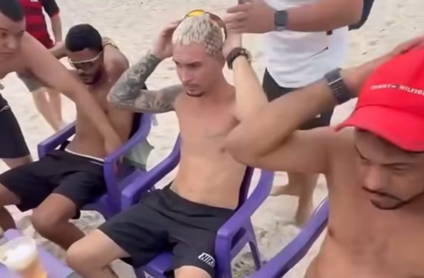 Os policiais pedem o documento de identificação dos quatro homens e fazem revista nos objetos em cima da mesa na praia. Os homens voltam a ouvir um alerta de um dos policiais sobre a postura: “Enche a porra da mão na cabeça”, diz um dos policiais civis.