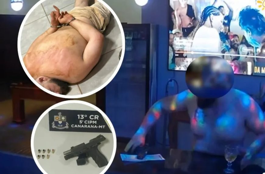 Um homem de 35 anos, completamente embriagado, causou pânico dentro de um cabaré em Canarana, a 608 km de Cuiabá, na noite de quarta-feira (1°). Câmeras de segurança flagraram o suspeito sem camisa, com uma pistola calibre 9 milímetros presa ao shorts, disparando várias vezes dentro do estabelecimento.