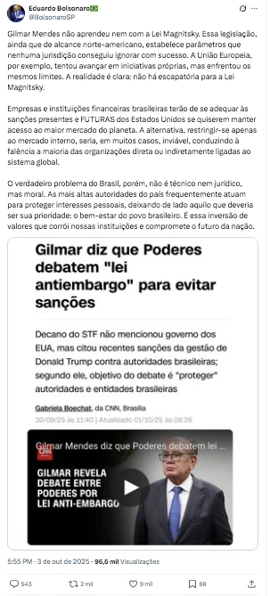 Segundo Eduardo, “Gilmar Mendes não aprendeu nem com a Lei Magnitsky”.