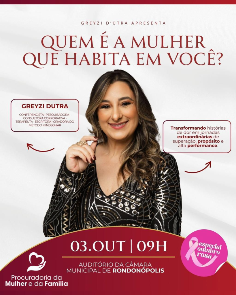 A vereadora Kalynka Meirelles, procuradora da Procuradoria da Mulher e da Família da Câmara Municipal de Rondonópolis, convida todas as mulheres da cidade a participarem da palestra “Quem é a Mulher que Habita em Você?”, que será ministrada pela conferencista e escritora Greyzi Dutra.