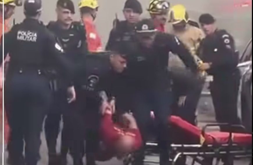 Após a saída da companheira, o suspeito ateou fogo na residência. Equipes da Polícia Militar e do Corpo de Bombeiros foram acionadas para controlar a situação. Um vídeo que circula nas redes sociais mostra o homem em aparente surto, sendo retirado do local e carregado por socorristas em uma maca.